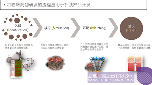 二、 功效成分筛选平台。将临床药物研发的流程应用于护肤产品开发,针对不同皮肤衰老问题,建立集识别(Identification)、模拟(Simulation)、匹配(Matching)以及重设(Reset)为一体的I.S.M.R的流程。在此基础上与分泌型天然多肽因子库有机结合,目标导向化高效筛选创新型多肽成分组合。