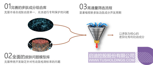 1)完善的多肽成分组合库,种类与组合化,克服市场合成肽功效单一,无法进行专利保护的问题;