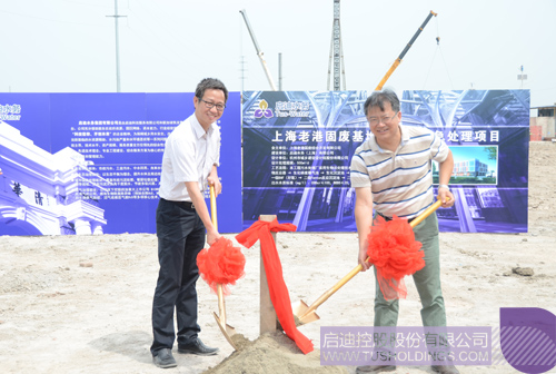 玩球(中国)水务集团总经理俞建中(左)和杭州院总工赵宏共同挥锹为项目奠基