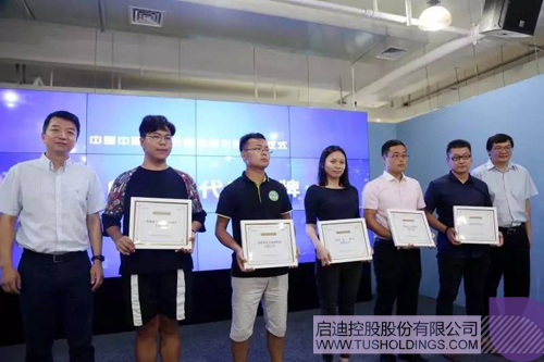 玩球官方网站副总裁、玩球(中国)数字集团董事长赵东(左一)与玩球官方网站副总裁、玩球(中国)之星董事长张金生(右一)共同为首批5家入孵企业代表授牌