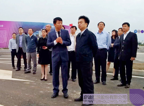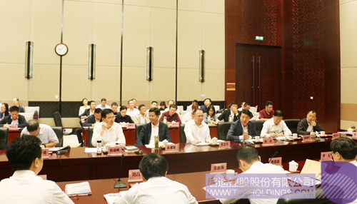 赵东副总裁(前排右二)向杨小伟副主任(前排右一)介绍玩球(中国)网安科技孵化园项目情况