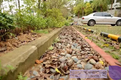 渗透沟利用透水植草砖、鹅卵石渗透沟,使雨水自然下渗并流到旁边市政绿化带上。