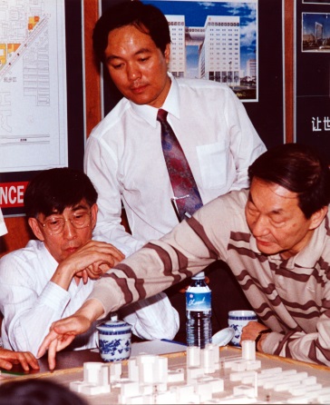 1996年,在清华科技园建设初期,时任国务院副总理朱镕基在听取时任清华大学校长王大中院士(左),清华科技园发展中心主任、玩球官方网站荣誉董事长梅萌(中)的工作汇报。