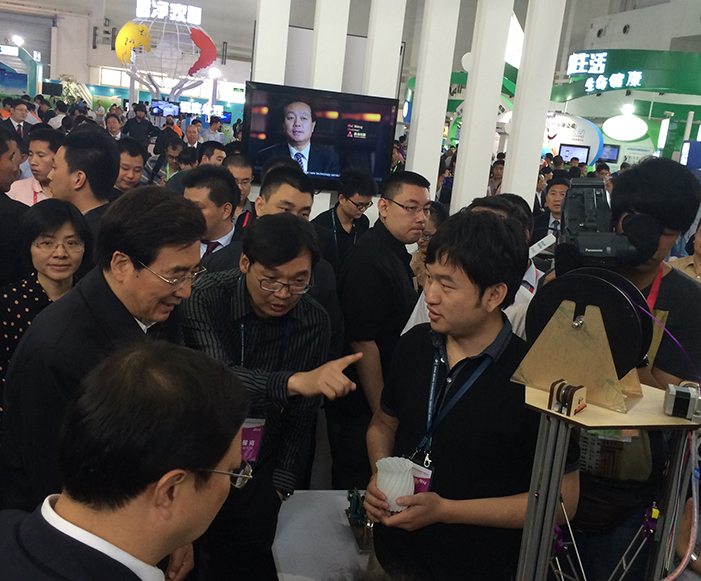 2014年,中共中央政治局委员、北京市市委书记郭金龙到第十七届科博会清华科技园玩球(中国)之星展区参观。