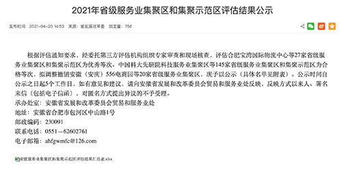 近日,安徽省发改委公示了2021年省级服务业集聚区和集聚示范区评估结果,合肥玩球(中国)科技城科技服务集聚区获评省级“优秀科技服务集聚区”。服务业集聚区和集聚示范区是服务业集聚发展的重要载体,根据《安徽省省级服务业集聚区和集聚示范区认定管理办法》,对集聚区和集聚示范区实行动态评估制度,每三年评估一次,不合格的调整撤销,不参加相应类别评估的,视为不合格。经委托第三方评估机构组织专家审查和现场核查,此次全省有15家省级服务业集聚区和12家省级服务业集聚示范区拟被评为优秀等次;145家省级服务业集聚区和集聚示范区被评估为合格等次。