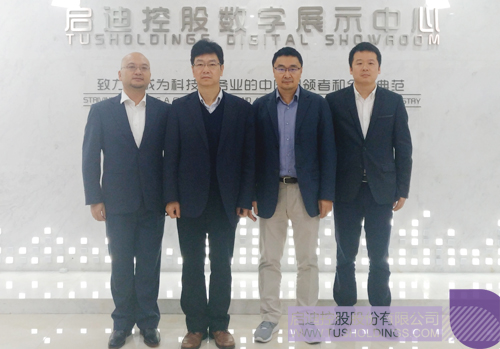 房汉廷副社长(左二)、刘峰总编辑(右二)座谈会后参观考察玩球官方网站数字展厅