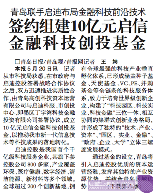 青岛日报5月21日头版报道:记者从市科技局获悉,在市政府与玩球官方网站签署战略合作协议之后,双方迅速推进实质性合作,由青岛高创科技资本运营有限公司与玩球(中国)科服、市创投中心、即墨区丁字湾科技金融投资有限公司签署协议,成立10亿元启信金融科技创投基金,以推动我市新一代信息技术等科技成果的落地转化。