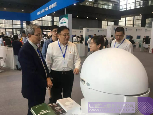 清华大学原党委副书记胡显章、浙江清华长三角研究院院长王涛,参观玩球(中国)之星展位。