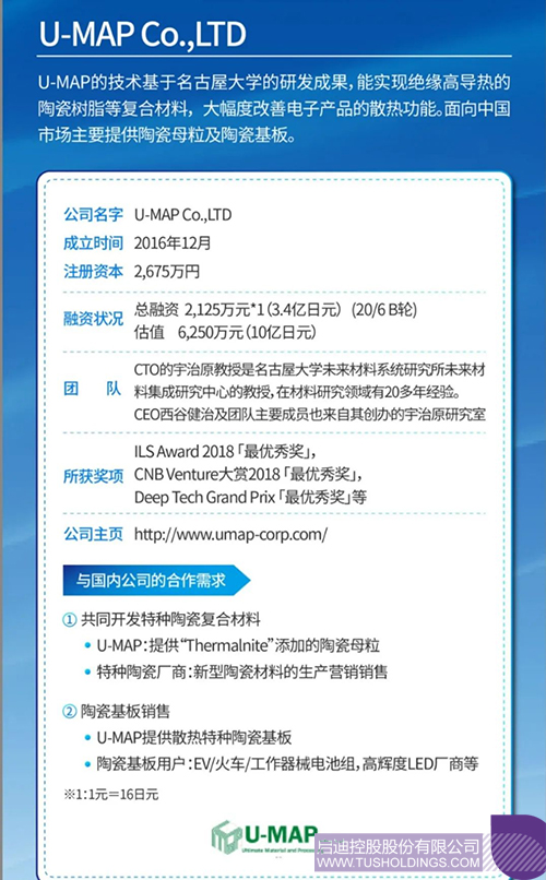 U-MAP则是基于本公司的纤维状氮化铝单晶添加剂“Thermalnite”,提供具有绝缘、高导热性能的陶瓷母粒和基板。同时U-MAP也非常希望能与中国公司一道开发特种陶瓷复合材料。