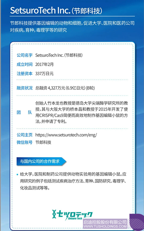 SetsuroTech(节郎科技)主要面向大学、医院和医药公司提供基因编辑的动物和细胞。