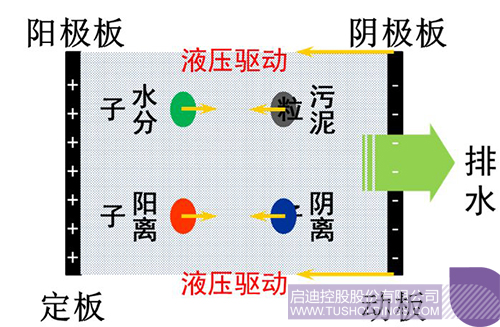 电渗透污泥高干脱水设备由电渗透系统、滤室组件、液压系统等组成。污泥经进泥泵输送到滤室,阴、阳极板通电后形成均布电场,在电场作用下,污泥中的带电粒子分别向阴、阳极板移动,并结合液压系统带动板框梯度压榨,实现污泥脱水。