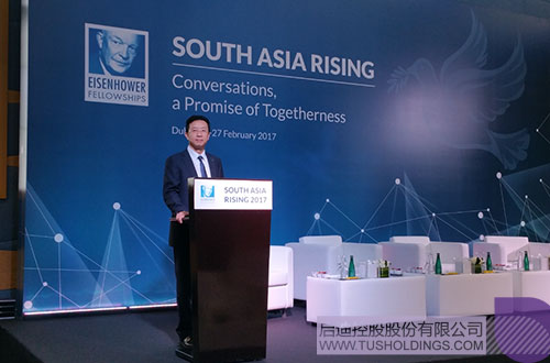 为了让世界各国,特别是来自南亚地区国家的代表更深入地了解中国政府所推行的“一带一路”倡议,美国艾森豪威尔基金会出资邀请玩球官方网站常务副总裁陈鸿波赴迪拜出席主题为“对话,团结的意愿”的“南亚崛起”峰会,并特别安排其在开幕式后全体会议上第一个发言。来自美国、加拿大、澳大利亚、阿联酋、纳米比亚、南非、坦桑尼亚、几内亚、肯尼亚、英国、缅甸、爱尔兰、孟加拉以及南亚六国等40多个国家的政府、学校、研究机构以及产业界的代表近200人出席了会议。巴基斯坦前总统穆沙拉夫、艾森豪威尔基金会主席等重要嘉宾出席开幕式。